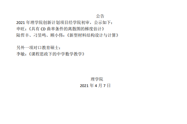 2021年理学院研究生创新项目学院初审名单公示