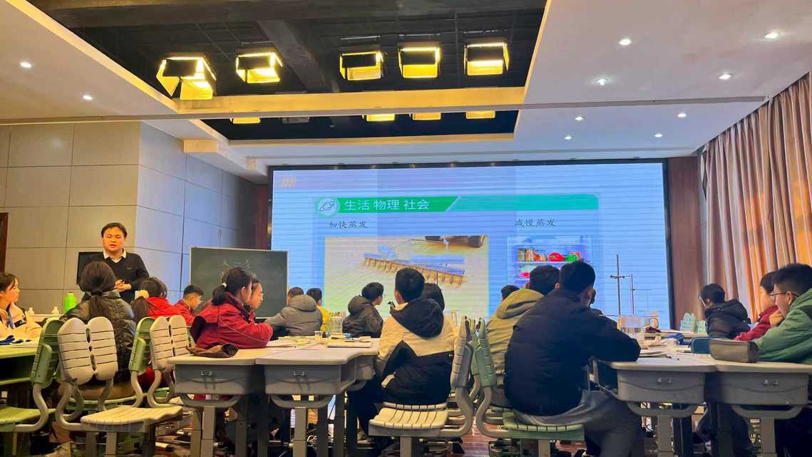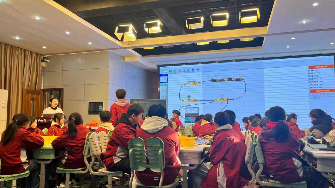 虹桥二中物理组顾老师、左老师分别开展“汽化”与“串联电路的故障分析”教学。在“汽化”教学中,教师以“传递火焰”导入课堂,吸引学生兴趣,逐步引入生活中关于汽化的现象,引导学生探究蒸发和沸腾的特点、影响因素等,助力学生建构汽化相关知识,提升学生实验探究能力;在“串联电路的故障分析”教学中,教师借助电路实物,设置故障情境,让学生在操作实践里分析故障成因与检测办法。两位教师均以“问题链”串联课堂,结合分组实验、数据记录与讨论总结,助力学生从现象观察迈向规律提炼,充分体现“学科实践”的教学理念。